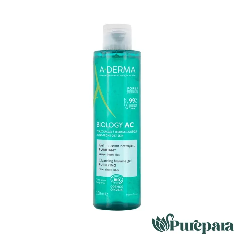 Aderma biology AC Gel moussant certifié BIO non-desséchant pour nettoyer en douceur les peaux grasses à tendance acnéique.