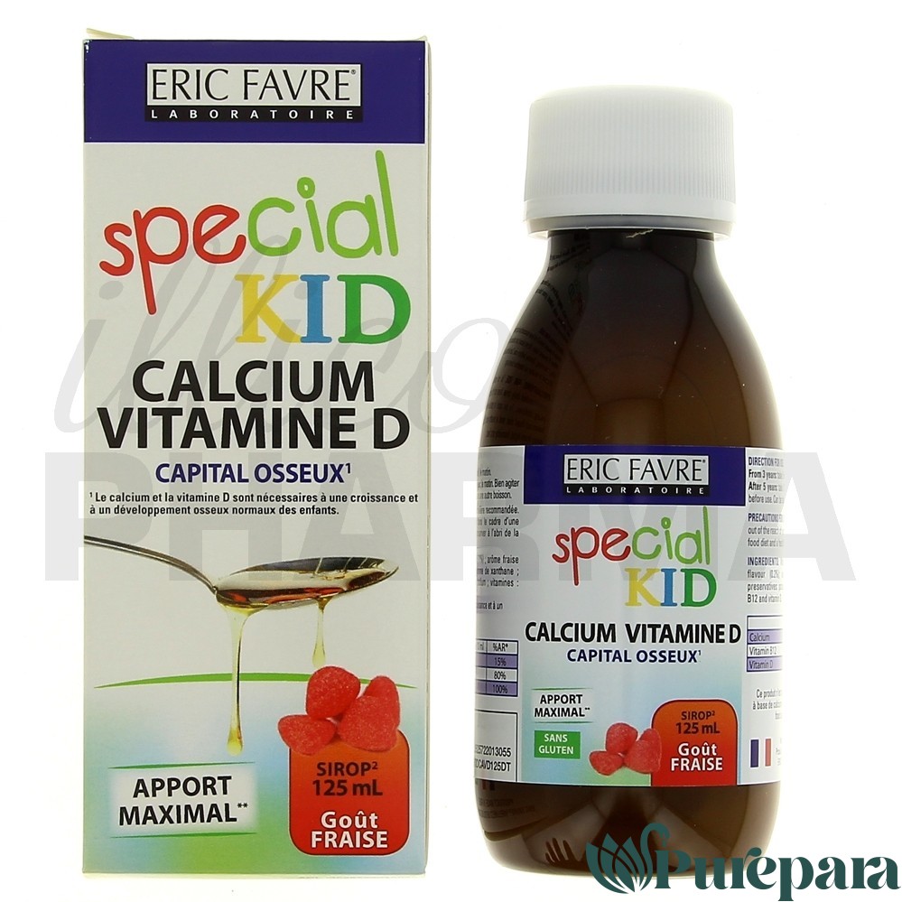 Eric Favre Special Kid Calcium Vitamine D 125 ml est un complément alimentaire spécialement formulé pour apporter à vos enfants tout le calcium et la vitamine D nécessaire à un développement osseux normal. Sirop au goût de fraise, flacon de 125 ml.
