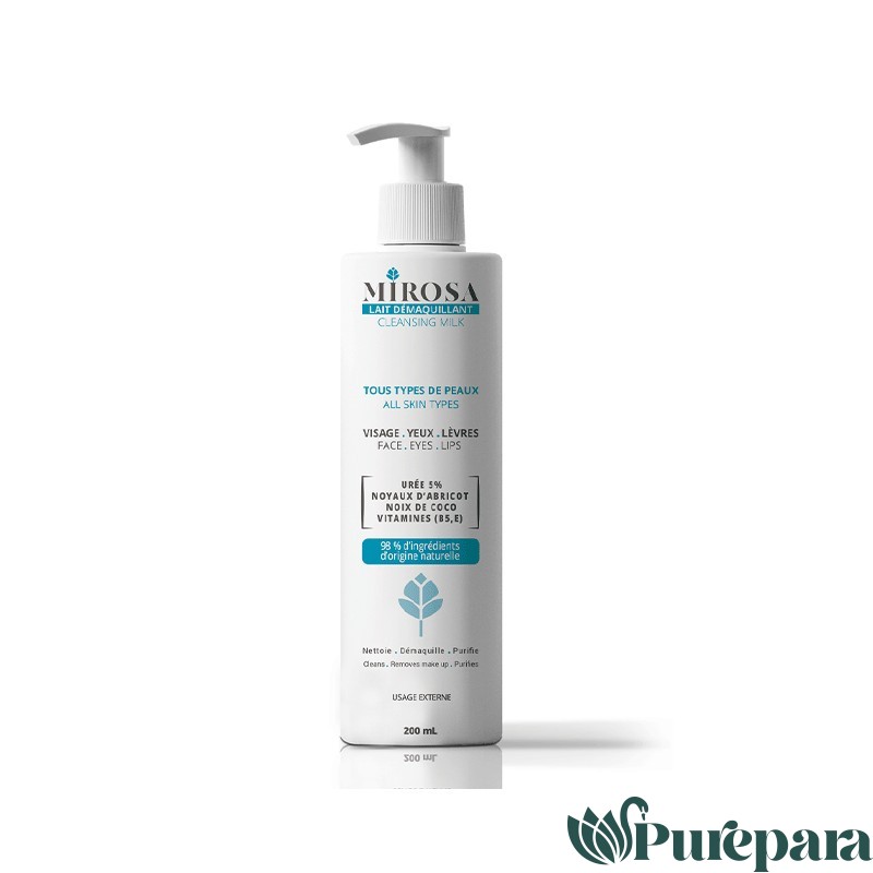 Lait démaquillant MIROSA riche en huile de noyaux d’abricot, huile de noix de coco et de provitamine B5 qui ont des propriétés apaisantes et hydratantes. Elle aide à : Nettoyer et démaquiller le visage et les yeux en un seul geste. Eliminer les impuretés et les cellules mortes. Résultat: peau nette, douce et confortable.