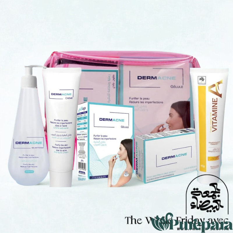 TROUSSE CURE DERMACNE SE COMPOSE DE : DERMACNE 30 GELULES DERMACNE CREME 45G DERMACNE GEL NETTOYANT 200ML DERMACNE SAVON 90 GR VITAL VITAMINE A 45Gr TROUSSE (OFFERT)